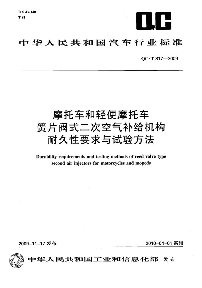 《摩托車和輕便摩托車簧片式二次空氣補(bǔ)給機(jī)構(gòu)耐久性要求與實(shí)驗(yàn)方法》QCT817-2009