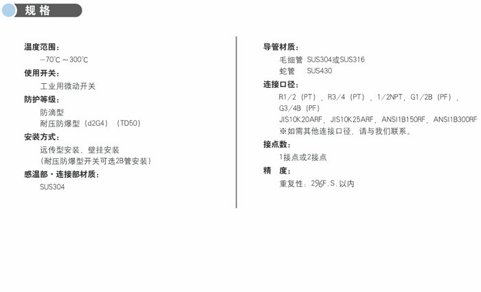 感溫元件和開關(guān)部分構(gòu)成.感溫元件內(nèi)部充滿了液體,通過液體的膨脹和收縮引起開關(guān)動作。本產(chǎn)品可根據(jù)現(xiàn)場環(huán)境選擇對應(yīng)的填充液和殼體構(gòu)造。